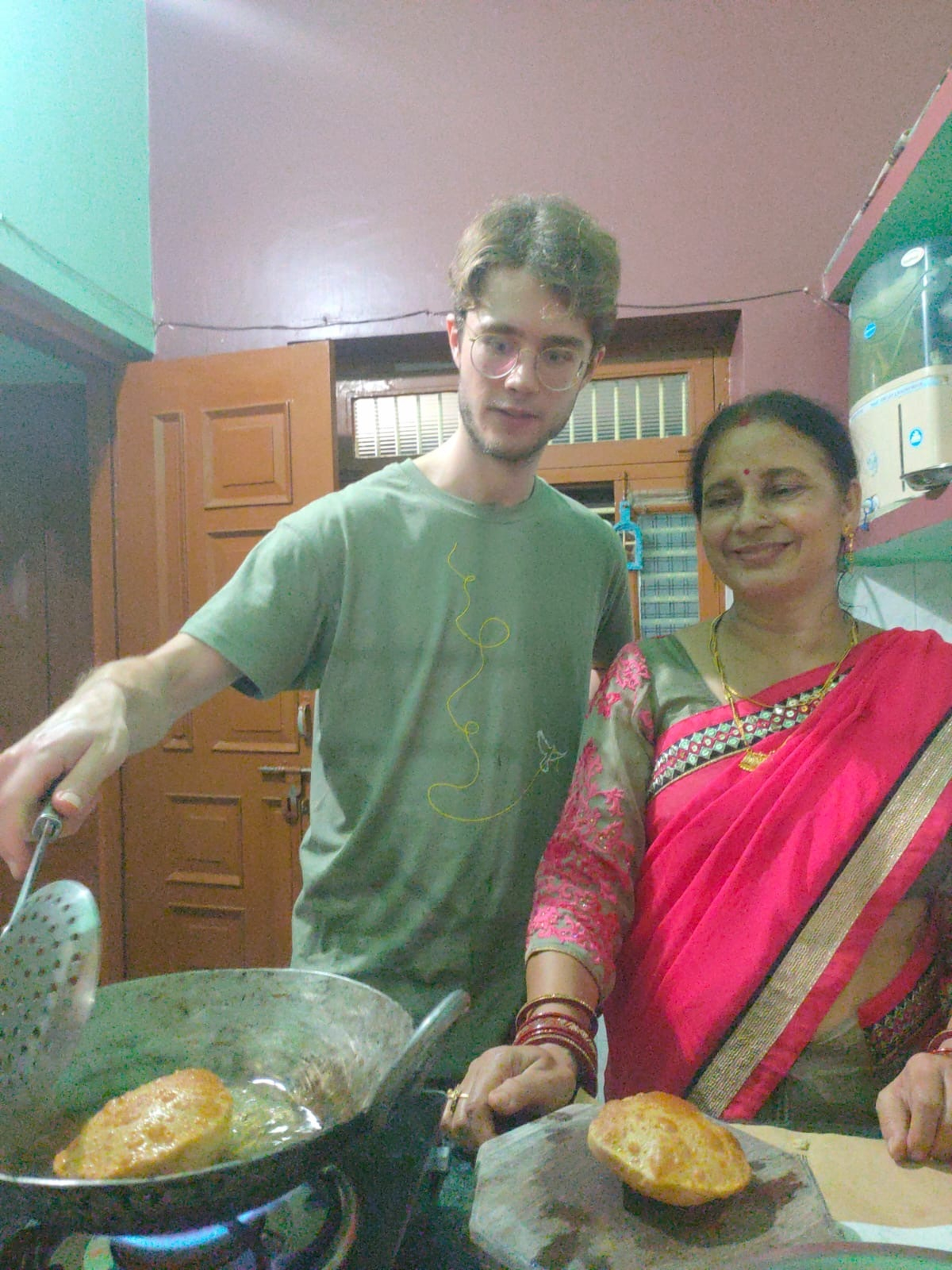 That weekend I went on the Vande Bharat to Bagaha, where I found Abhishek and his father. They drove me to his house. In no time, I had met his entire family, who were lovely. The person who fascinated me most was Abhishek’s grandfather, who was reading the Gita and other smriti books in a little shed in front of the house. He had given all this land that he had bought relatively cheaply from the Britishers, when they suddenly had to leave in 1947… Since he couldn’t pay everything in one go, he even still transferred money after they had long left (unimaginable now!). For several years now, he had fully devoted himself to God. The family and I cooked together, held pujas together, made flower rangolis, lit diyas, and much more. The hospitality was, in every sense, overwhelming.